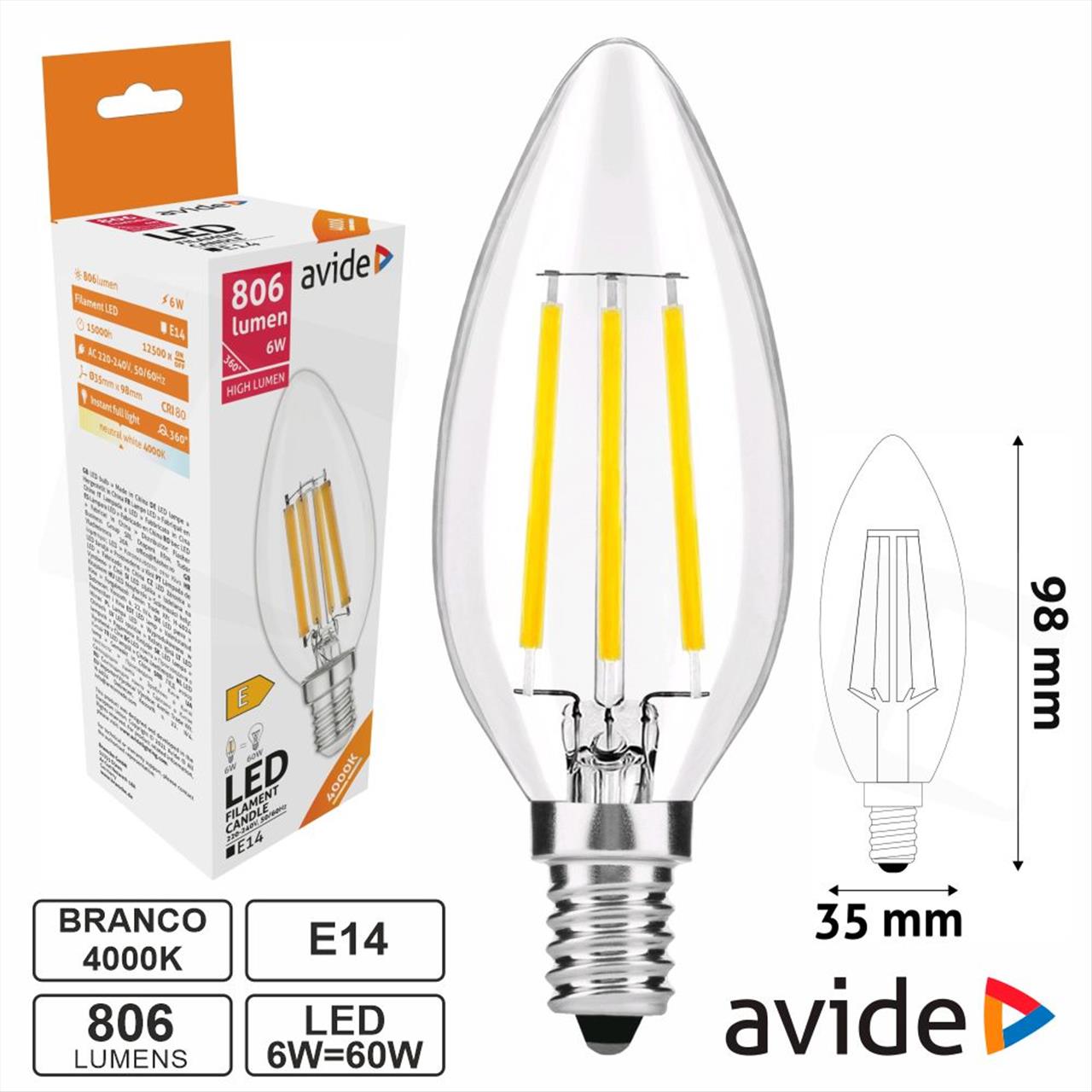Λάμπα Avide LED, filament κερί, 6W, E14, 360°, λευκό φως(4000K), high lumen