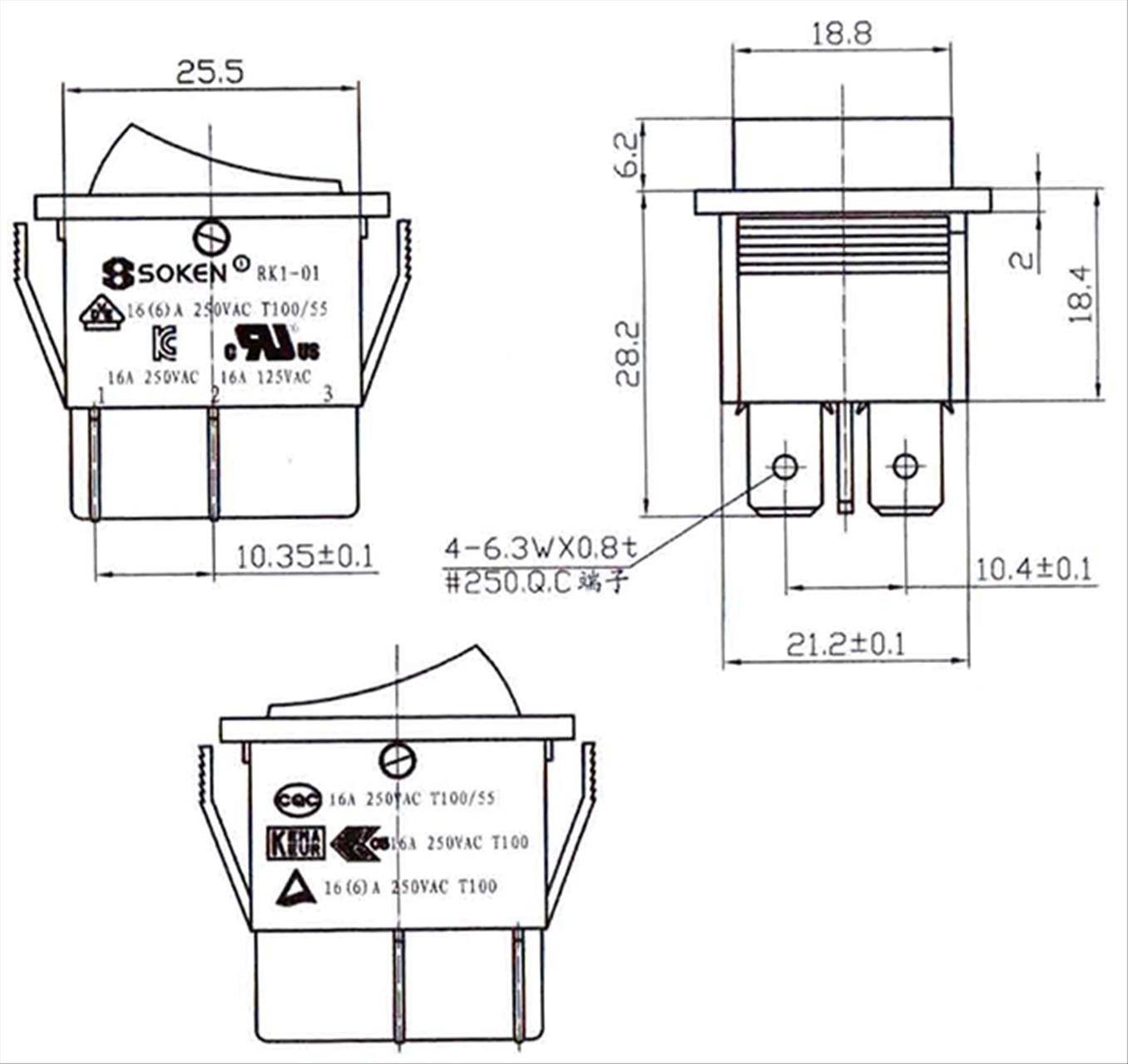 Διακόπτης rocker on-off-on, μεγάλος, 6P, 16A/250V, μαύρος, RK1-01 SKN
