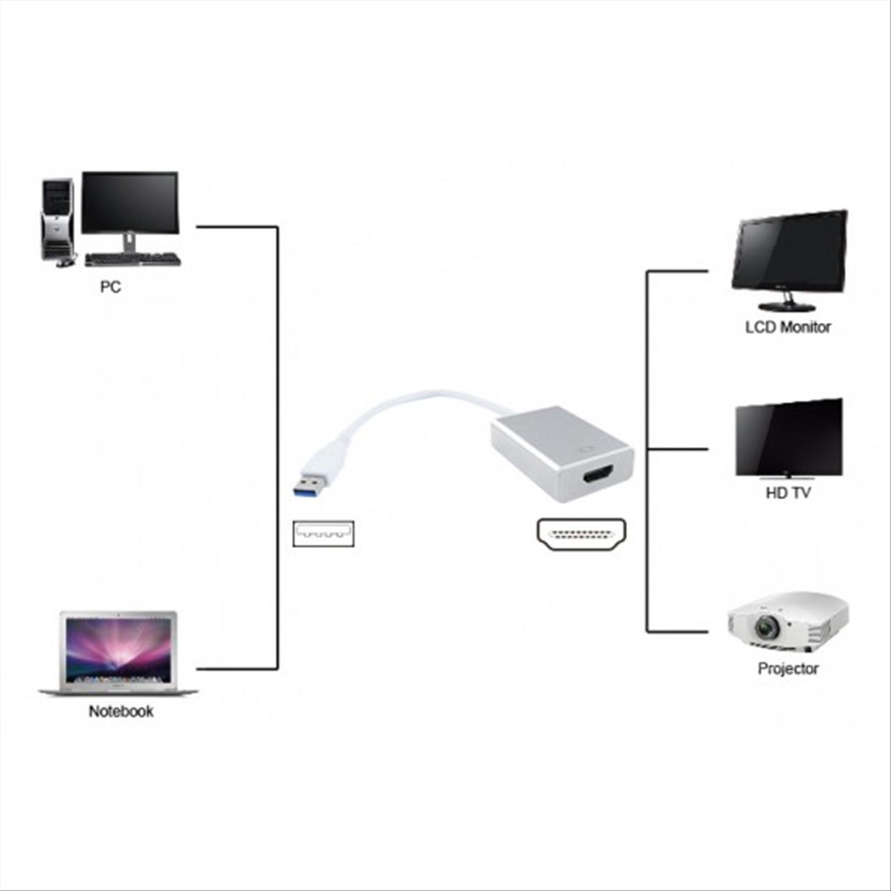 Αντάπτορας για σύνδεση συσκευών με έξοδο USB 3.0 σε οθόνες και προτζέκτορες με HDMI είσοδο. Υποστηρίζει ανάλυση έως 2048x1152p, με ήχο.