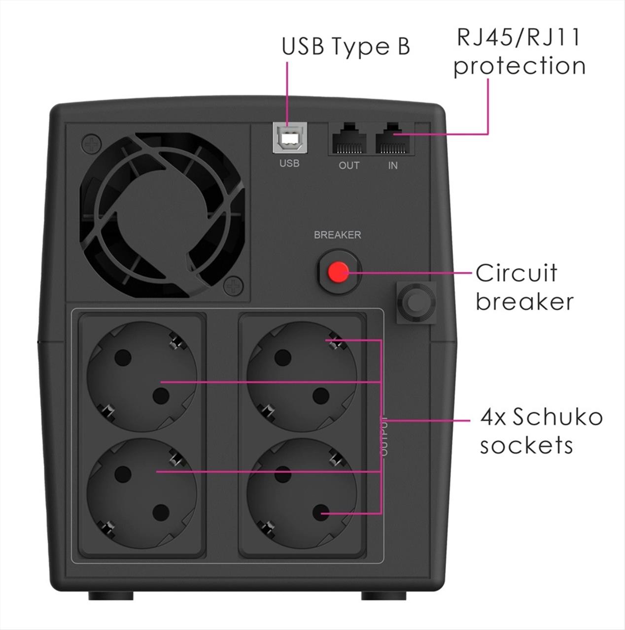 Output: 4x Schuko, 2x RJ45/RJ11, 1x USB Type B