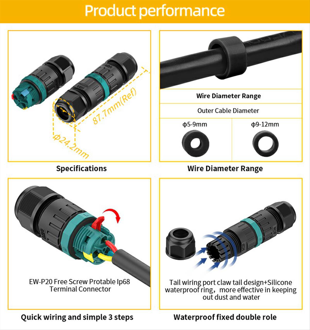 Σύνδεσμος γραμμικός-Fast connector, 2P+T (2 Πόλοι+Γείωση), 16A, 2.5mm², EW-P20, IP68